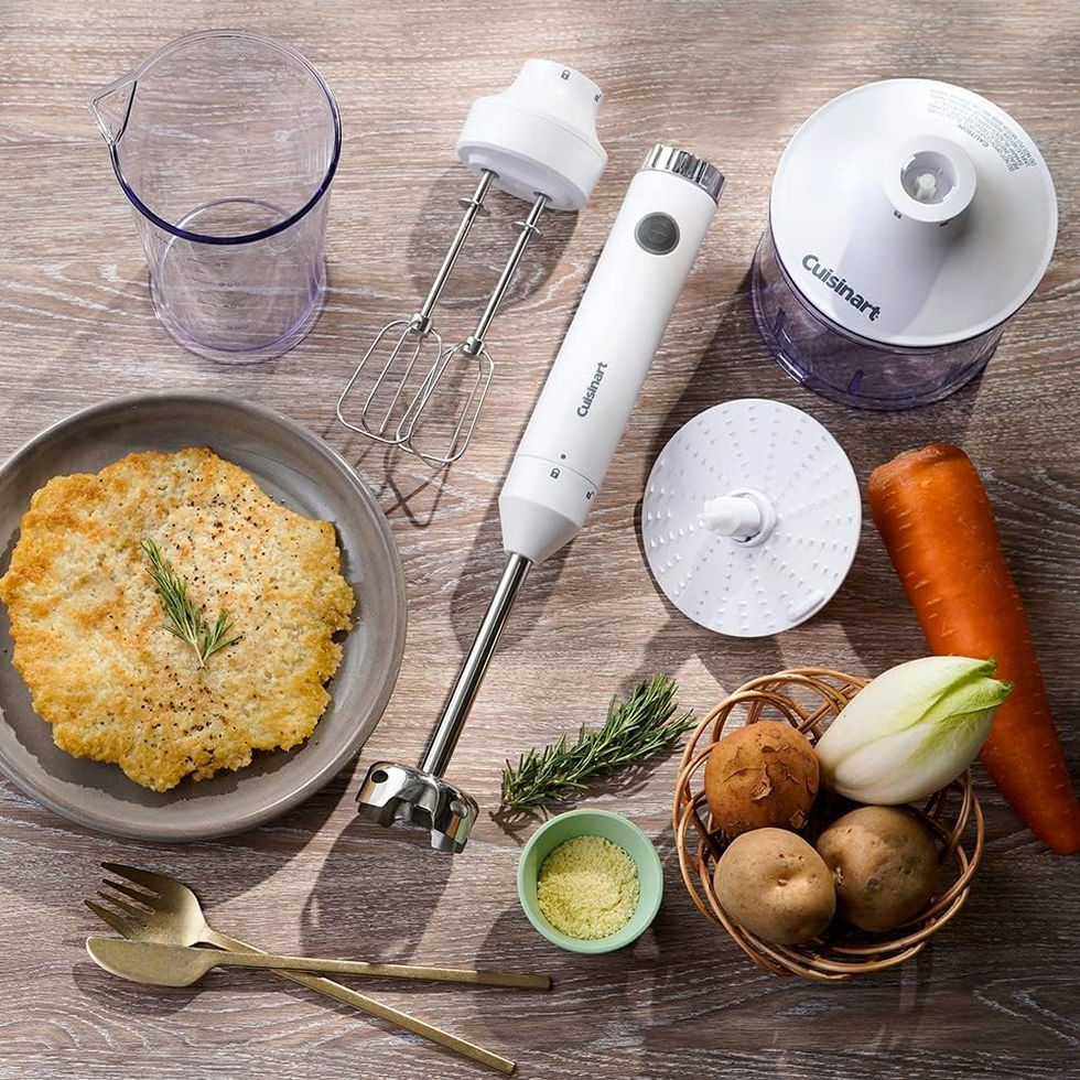 「クイジナート スリム&ライト マルチ ハンドブレンダー HB-704WJ」は、つぶす・混ぜる・泡立てる・かき混ぜる・刻む・おろすの6機能を1台に搭載した多機能ブレンダーセットです。