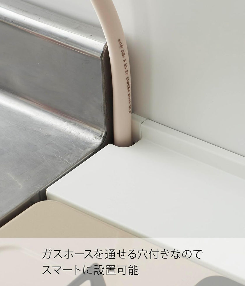 ガスホースを通せる穴付き仕様で、安全性と利便性にも配慮。棚板は上に開閉できる設計で、設置したままでも元栓の操作が可能です。油はねや調理汚れから壁をしっかりガードし、掃除も簡単に。